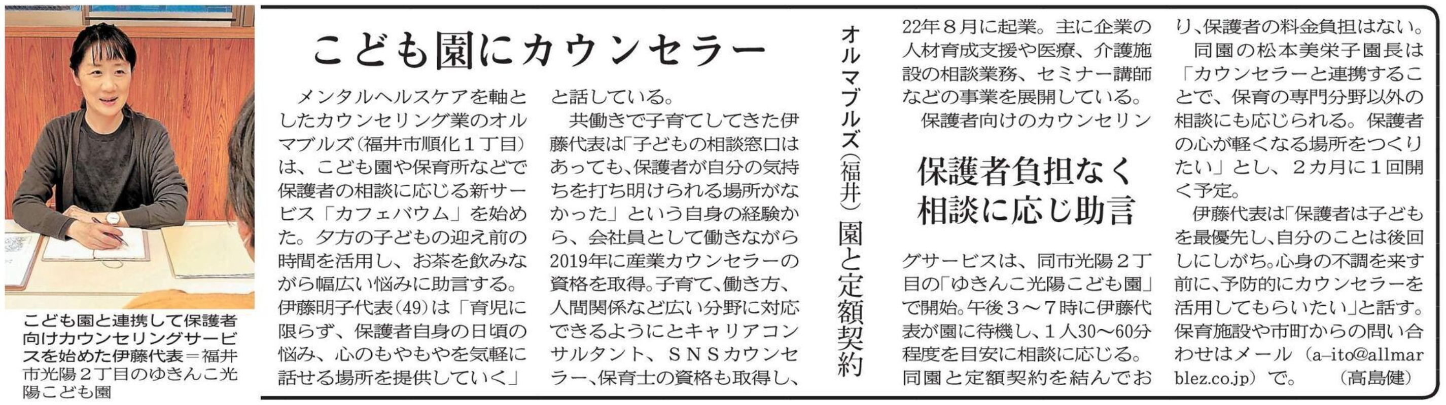 メンタルヘルスケアを軸としたカウンセリング業のオルマブルズ(福井市順化1丁目)は、こども園や保育所などで保護者の相談に応じる新サービス「カフェバウム」を始めた。夕方の子どもの迎え前の時間を活用し、お茶を飲みながら幅広い悩みに助言する。伊藤明子代表(49)は「育児に限らず、保護者自身の日頃の悩み、心のもやもやを気軽に話せる場所を提供していく」と話している。